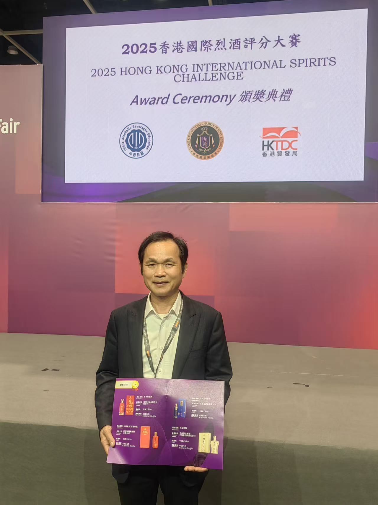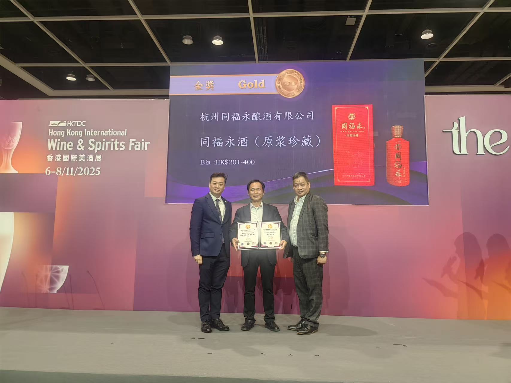 作为本届香港美酒展参展商之一的杭州同福永酿酒有限公司总经理沈士良介绍道:“2025香港国际烈酒评分大赛是由香港酒业总商会与中酒荟萃教育主办,香港贸发局协办的国际烈酒赛事,参赛酒品汇集了中国白酒、传统黄酒及药酒、威士忌、白兰地、干邑、伏特加、琴酒等种类。赛事采用国际通用全盲品机制,隐去品牌与产区信息,并按价格段分组评测。赛事邀请国内权威白酒专家及国际评委共同参与。所有获奖产品均需通过国家级第三方检测机构理化指标检验,所获荣誉在业界具有一定的标识性和权威性。我公司参赛的两款白酒品牌‘塘矛原浆酒(53°酱香型)’及‘同福永酒(原浆珍藏)(43°清香型)’双双在此次大赛中荣获金奖。”